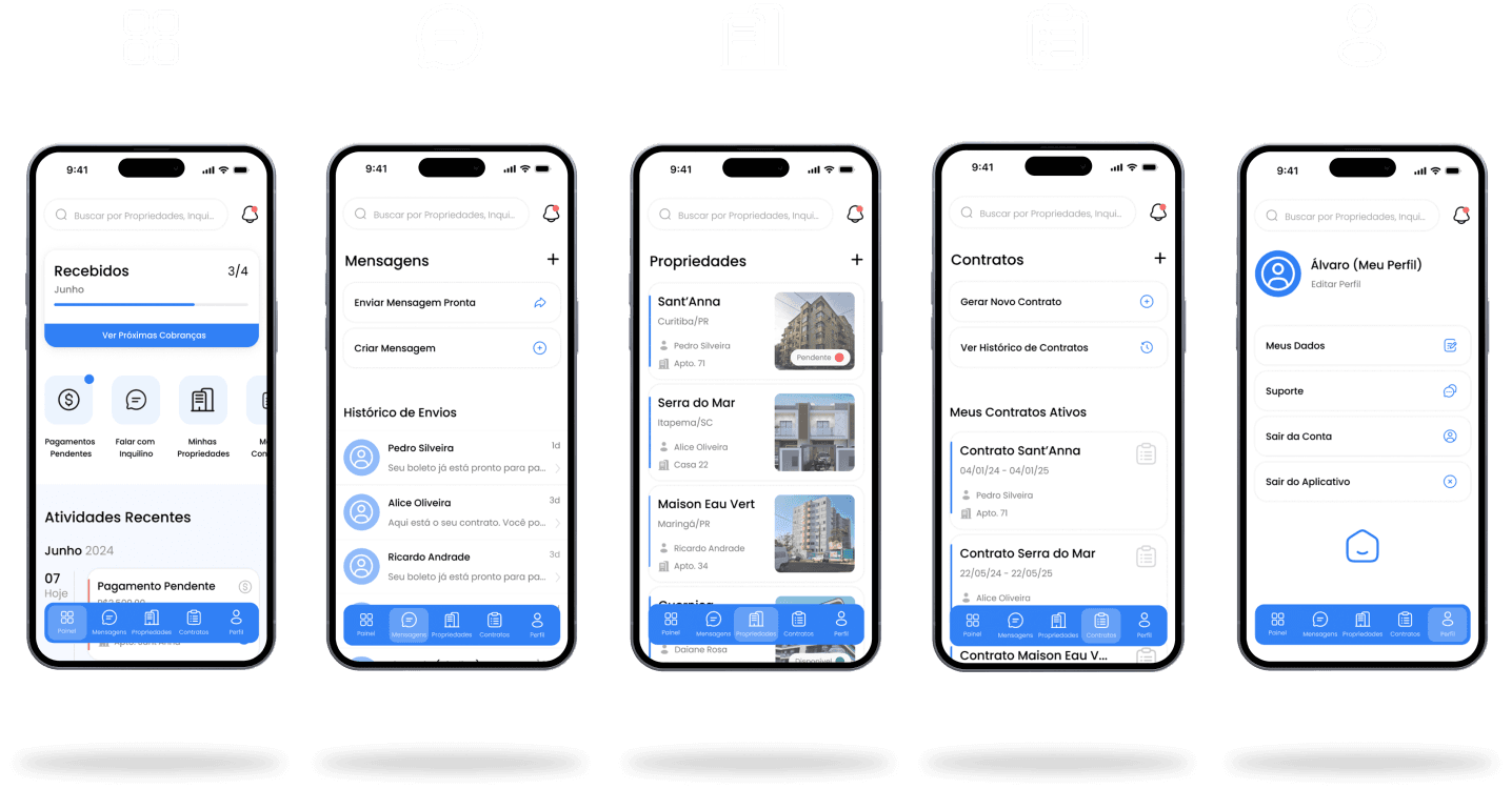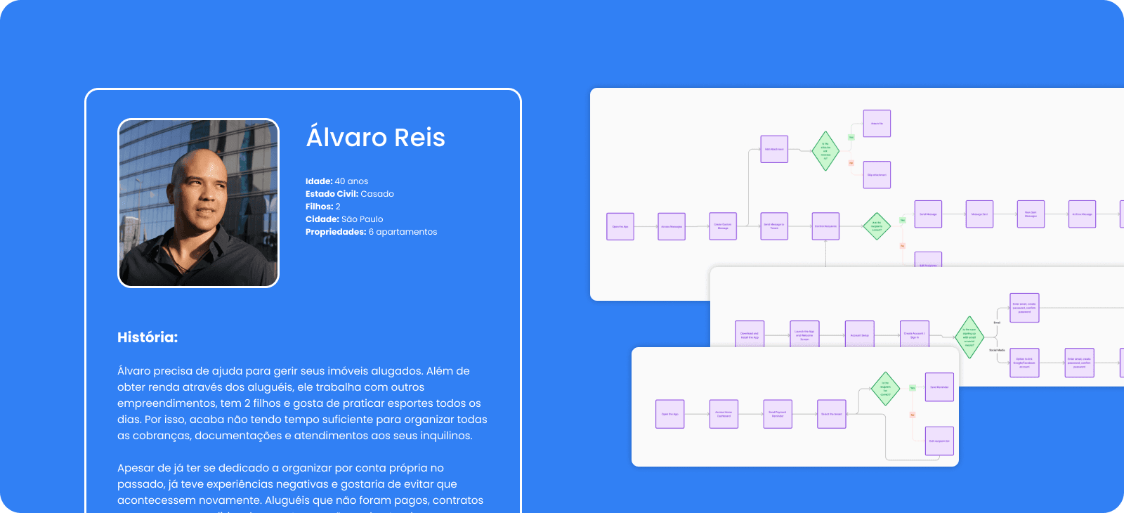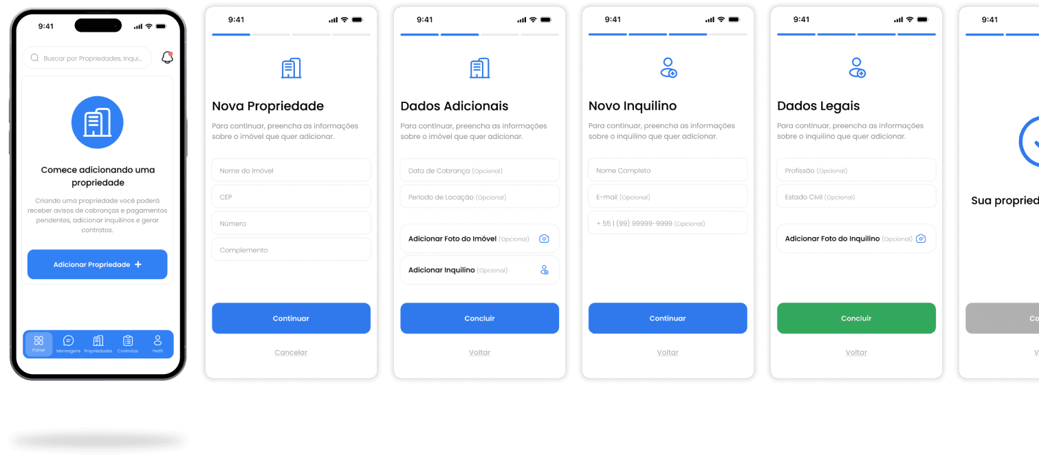 O principal objetivo deste projeto foi projetar um protótipo de um MVP para ajudar a validar a ideia e realizar testes com usuários. Comecei definindo uma proto-persona e construindo user flows para todas as tarefas que o cliente definiu como necessárias, como cadastro de usuários, propriedades e inquilinos, atualização de status de pagamento, geração de contratos e envio de mensagens pré-escritas.